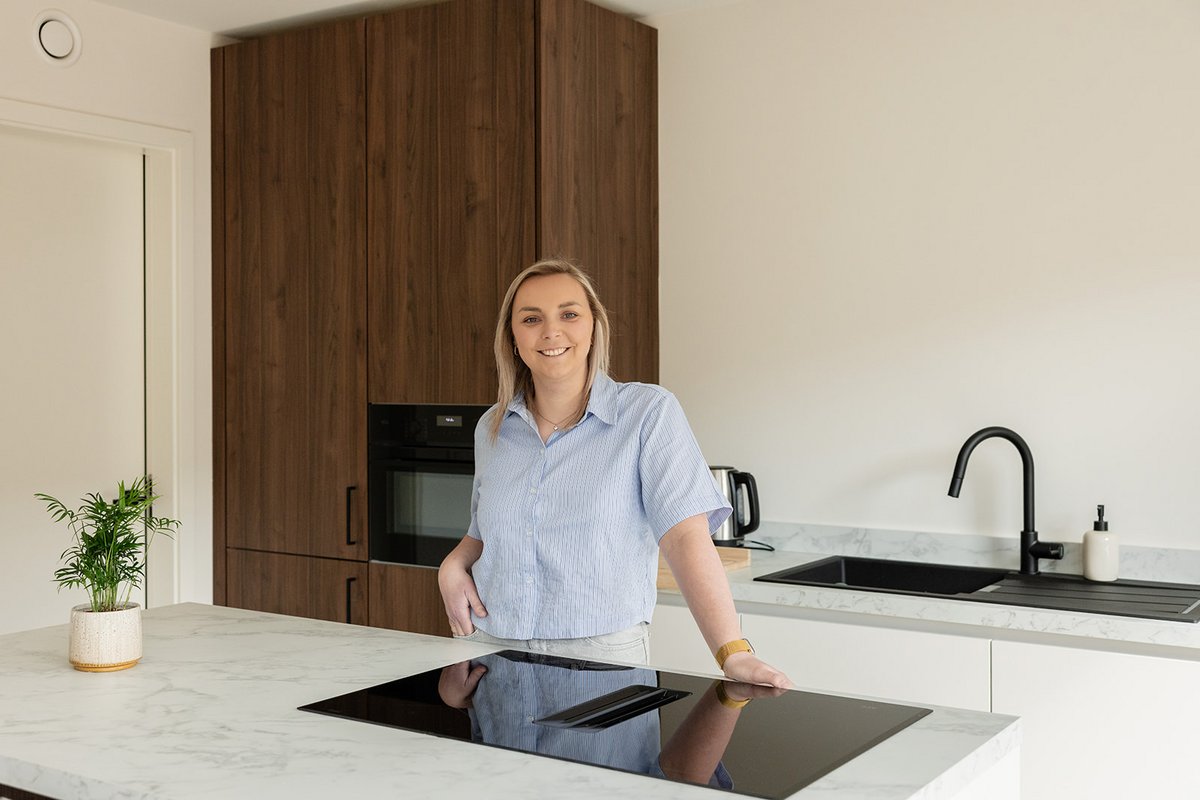 Omdat Eline eerder al een sleutel-op-de-deur woning had gekocht, ging ze ook deze keer bewust op zoek naar een sleutel-op-de-deur project. “Ik vind het proces gewoon heel gemakkelijk. Je gaat je keuken, badkamer en vloeren kiezen en al de rest wordt voor je gedaan.”