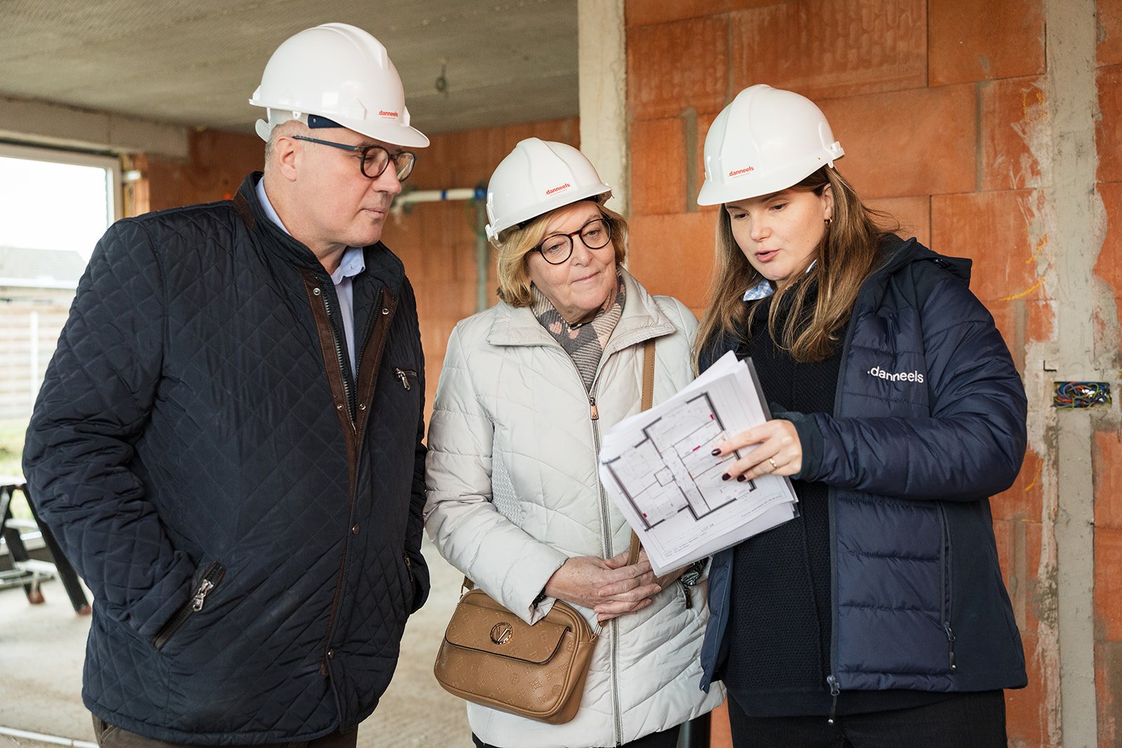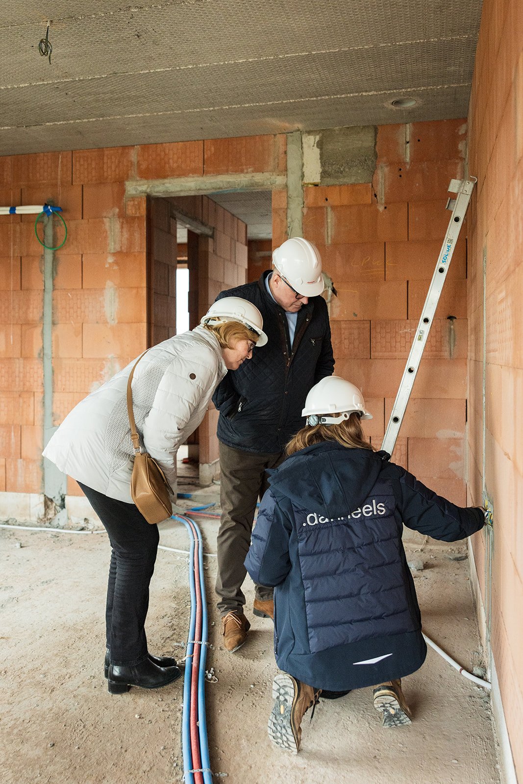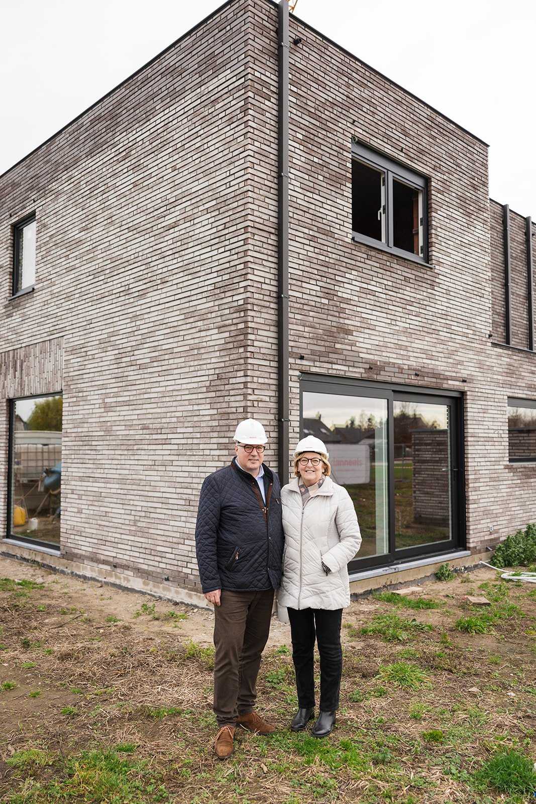Voor dit interview ontmoeten we Gunther en Heidi samen met klantenbegeleidster Louisa tijdens hun eerste werfbezoek. Desondanks dat ze regelmatig eens komen kijken naar de woning, is dit de eerste keer dat ze hem vanbinnen zien. “Het is heel fijn om hier rond te kunnen wandelen. Zo veel lichtinval en een mooi zicht op de tuin”, glimlacht Heidi.