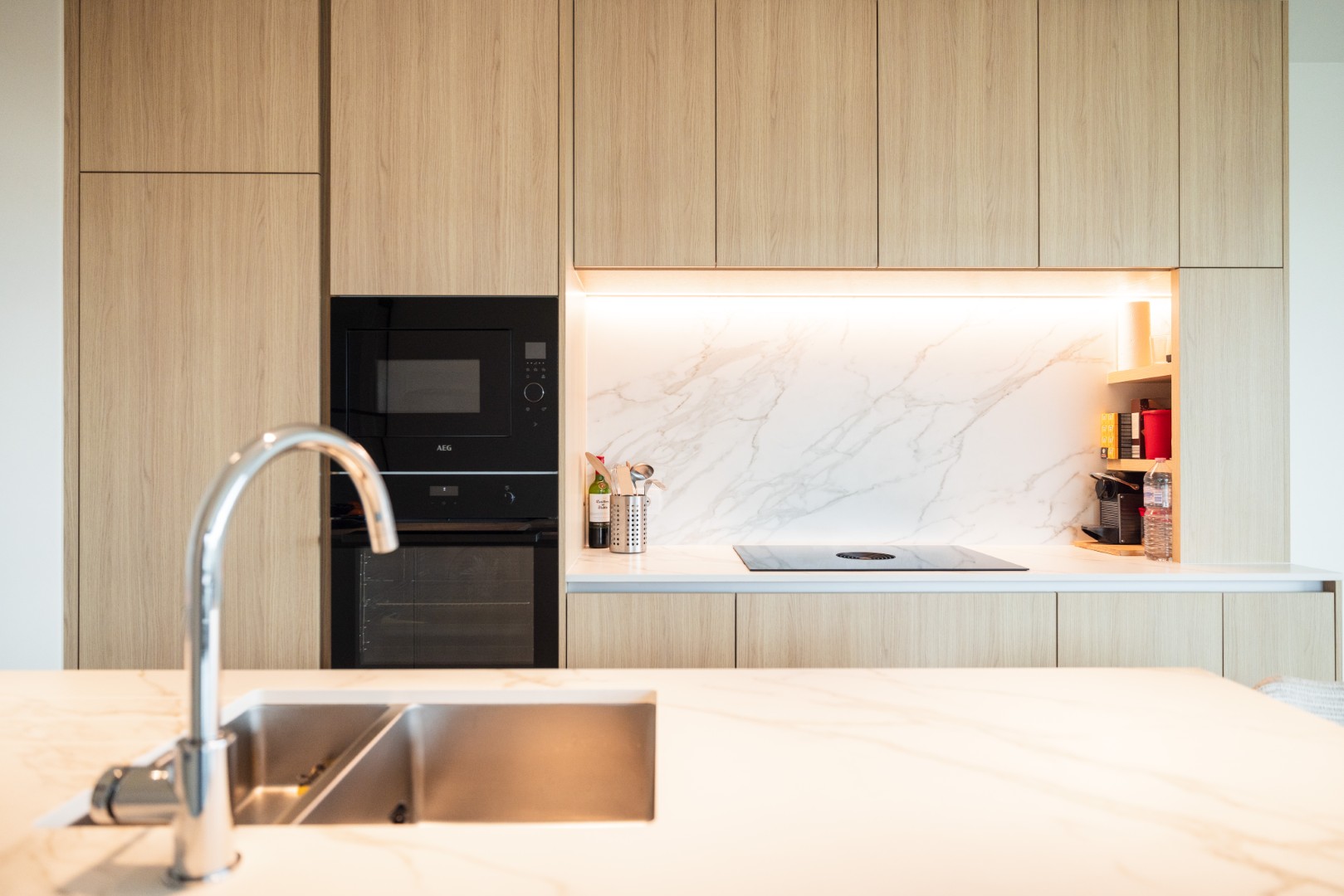 Bij de inrichting was het belangrijk dat het appartement ook zou voldoen op hun oude dag. Damienne: “Er was een mooi budget voorzien in het lastenboek, maar we hebben toch wat extra’s toegevoegd. Dat is een keuze uiteraard. Zo heeft de keukenbouwer ook inbouwkasten geplaatst in de slaapkamers en de gang en hebben we het keukeneiland verlengd met een extra tafel.”