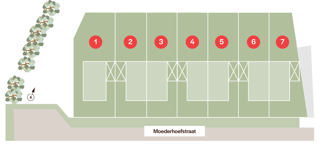 In de Moederhoefstraat in Lint realiseert Danneels zes halfopen bebouwingen en één vrijstaande woning in verfijnd hedendaagse stijl.