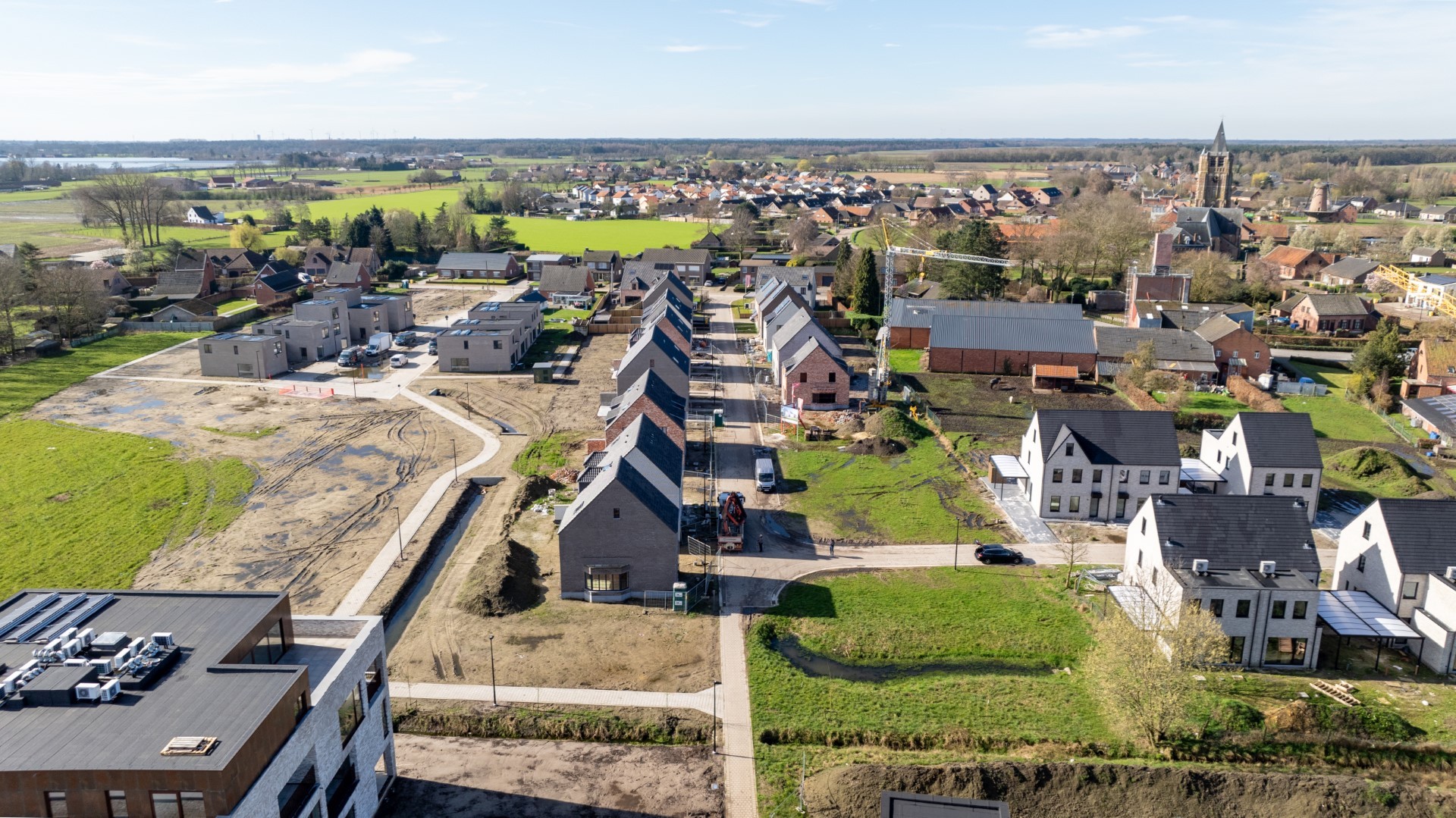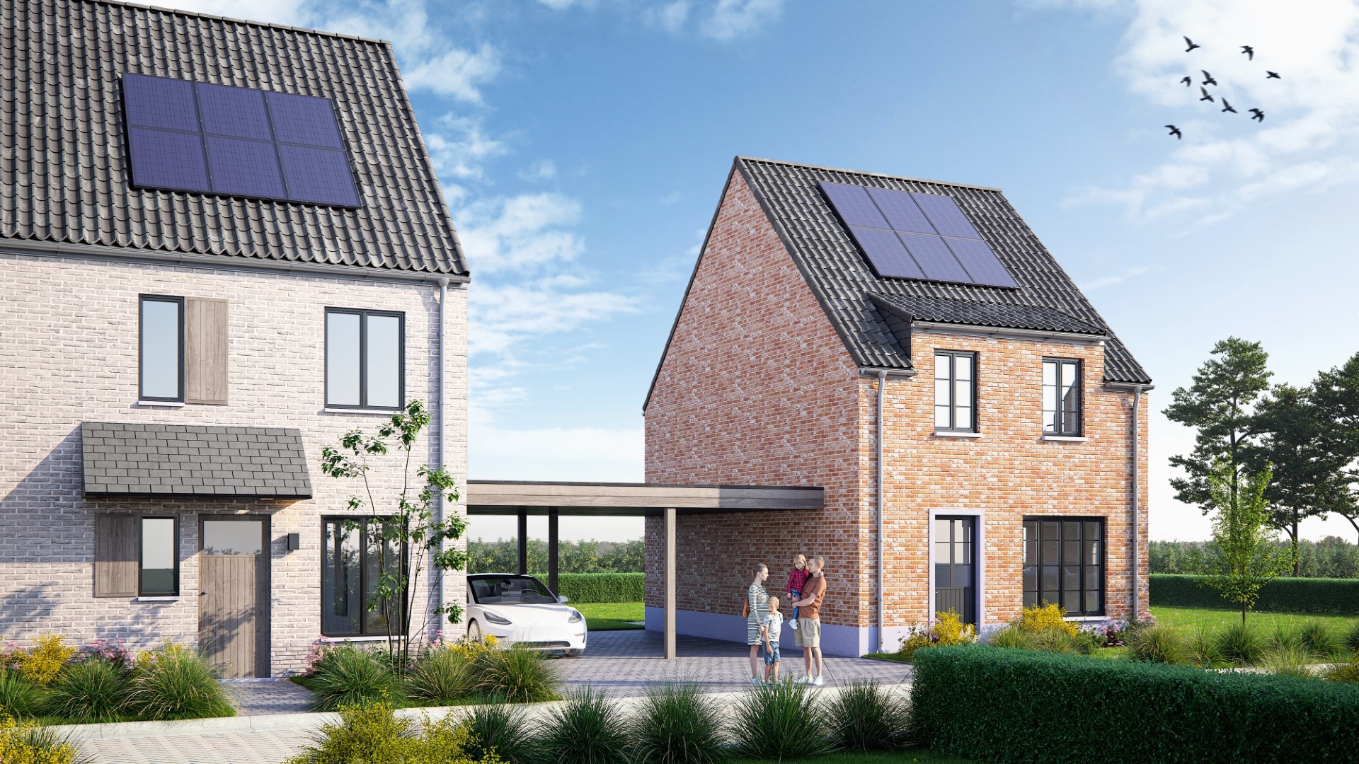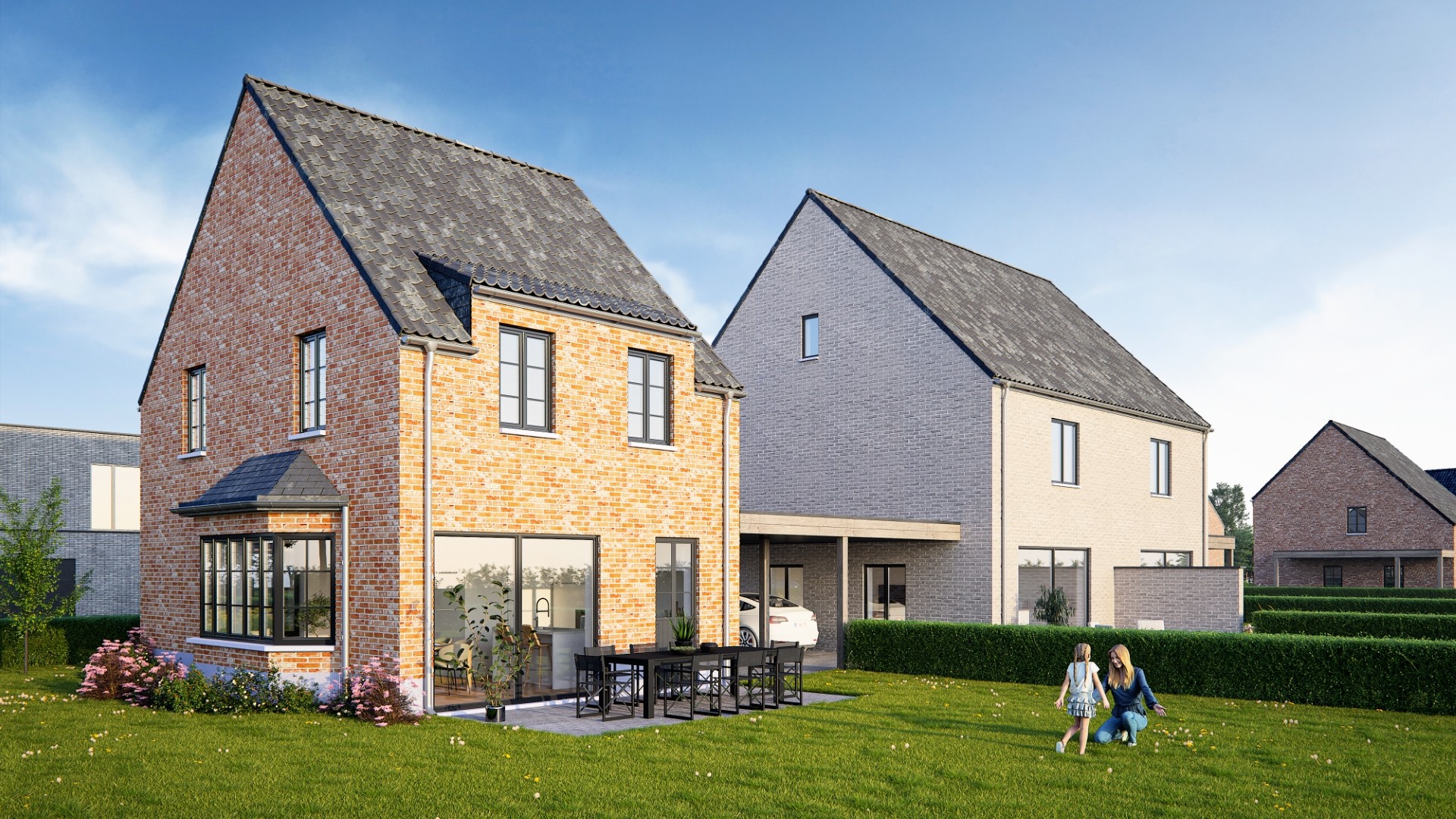 Langs de Elzenstraat in Weelde realiseerde Danneels stijlvolle gezinswoningen in een nieuwe groene wijk. Een mix van open en halfopen bebouwingen in hedendaags landelijke stijl.